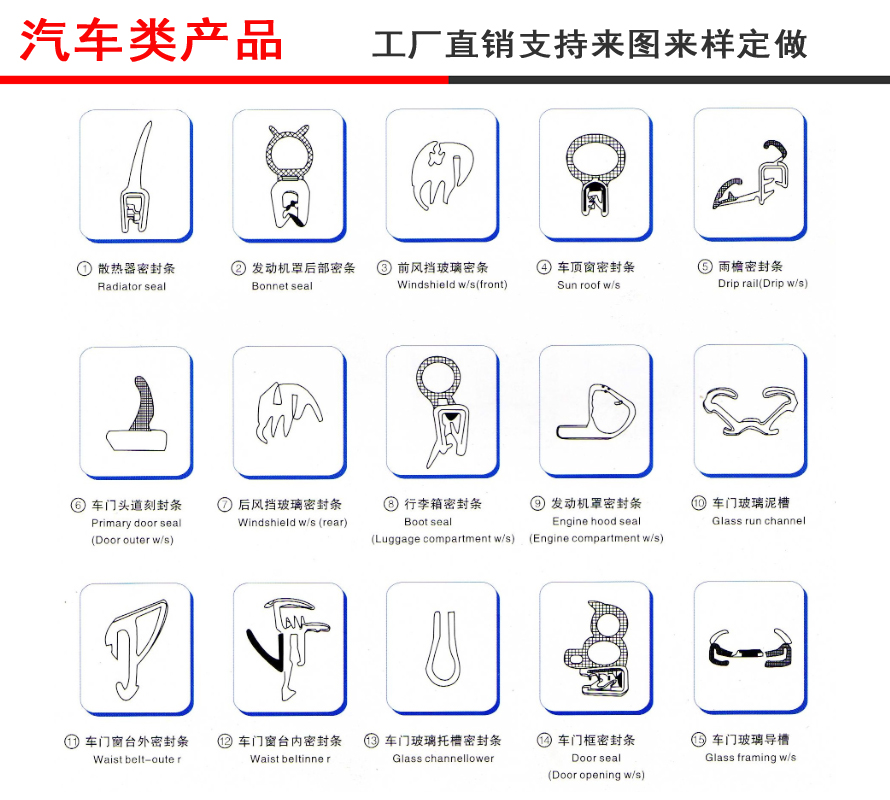 內外側條(水切)(waistline),行李箱密封條(trunk seal),防噪聲密封條(anti-noise),防塵條(anti-dust)等。